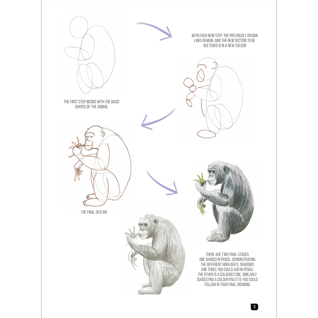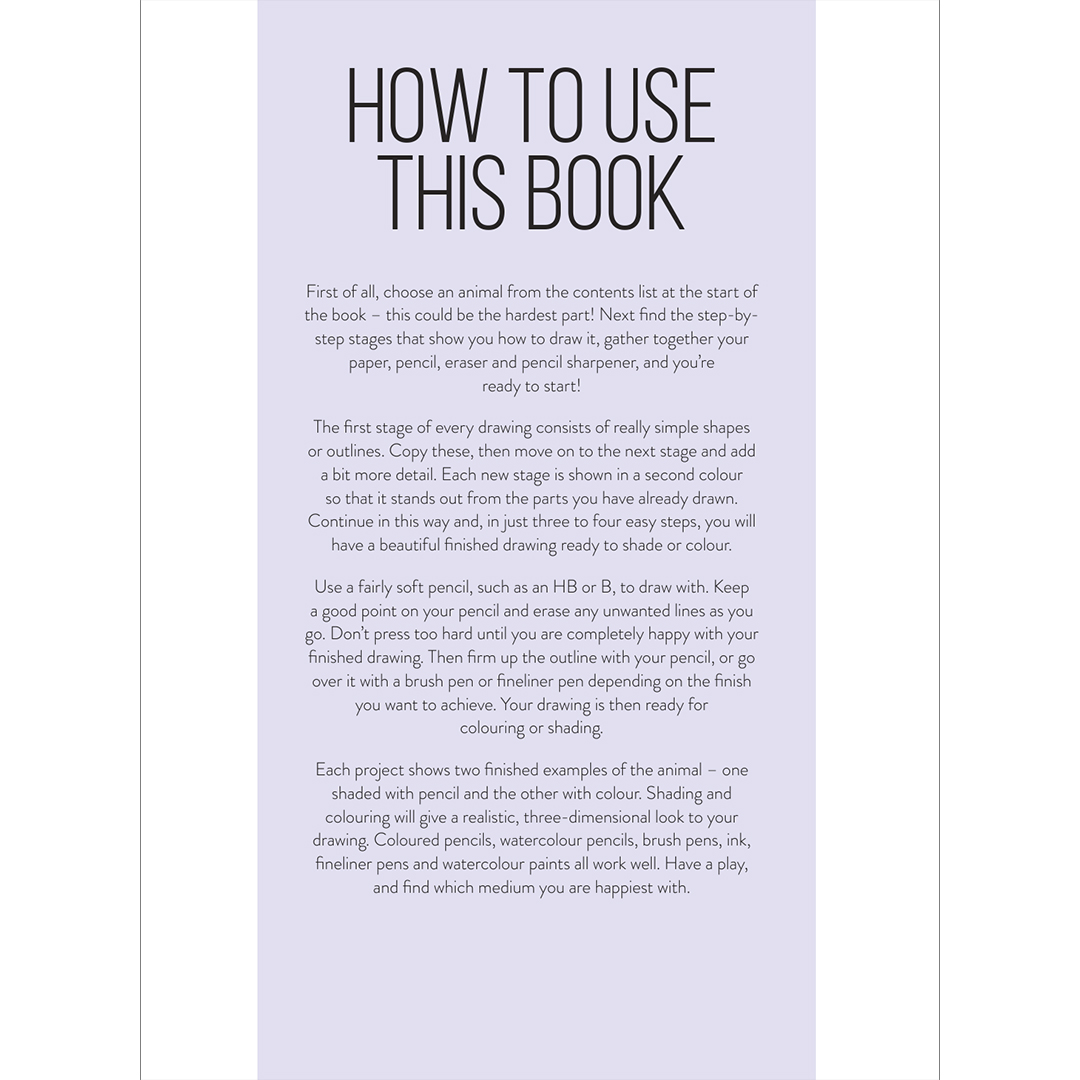 Each animal is broken down into three or four simple stages that guide you smoothly through to the finished drawing. There are no written instructions to follow – just basic shapes and pencil strokes. Even if you’ve never drawn before, you’ll be amazed at how quickly you can produce impressive artwork. Each project also shows two finished examples of the animal – one shaded in pencil and the other in colour.