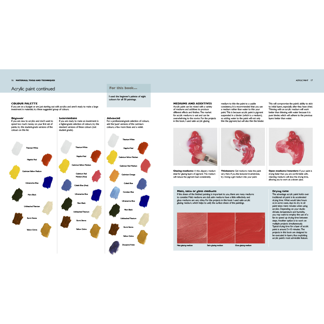 This unique book works as a complete course in acrylic painting, built around key techniques. As you progress through the book's sections, the author demonstrates each technique by creating a mini painting measuring 5-inch (12.75 cm) square. By the end, you'll have an amazing collection of 50 mini paintings – on board, paper or canvas – that testify to your skill and creativity.