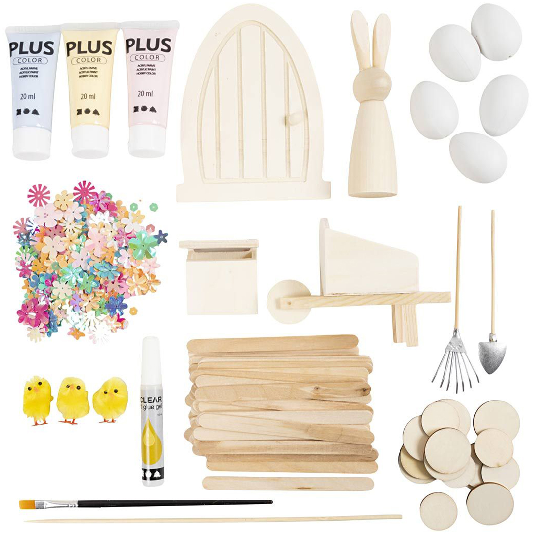 Contents: door, bunny, mailbox, rake, spade, wheelbarrow, chicks, plastic eggs, flower sequins, wood discs, ice lolly sticks, flower sticks, Plus Colour craft paint, brush and glue.