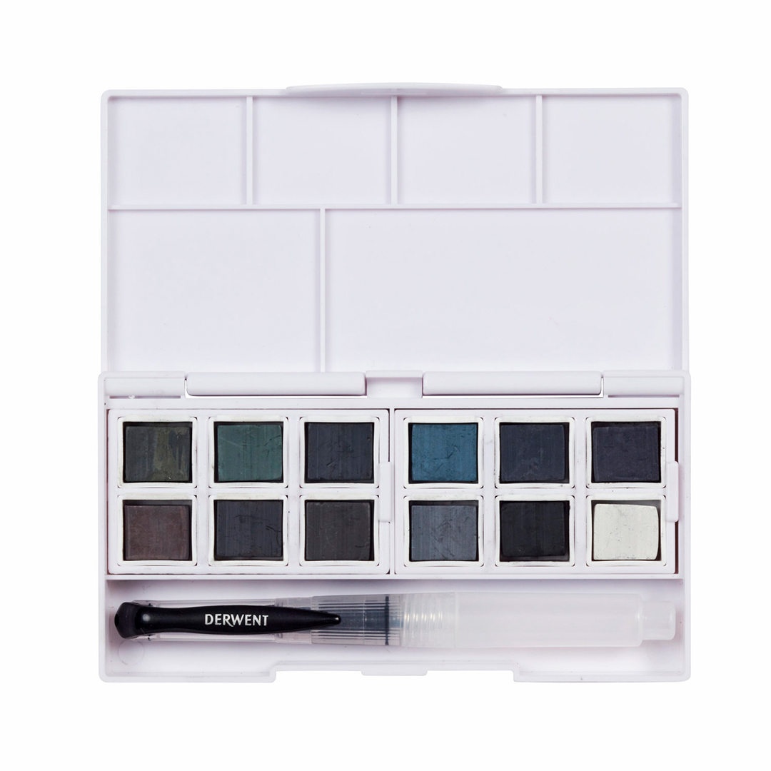In addition to the 12 colours, the set includes 6 palettes for mixing and a small water brush – all conveniently packed for easy portability!