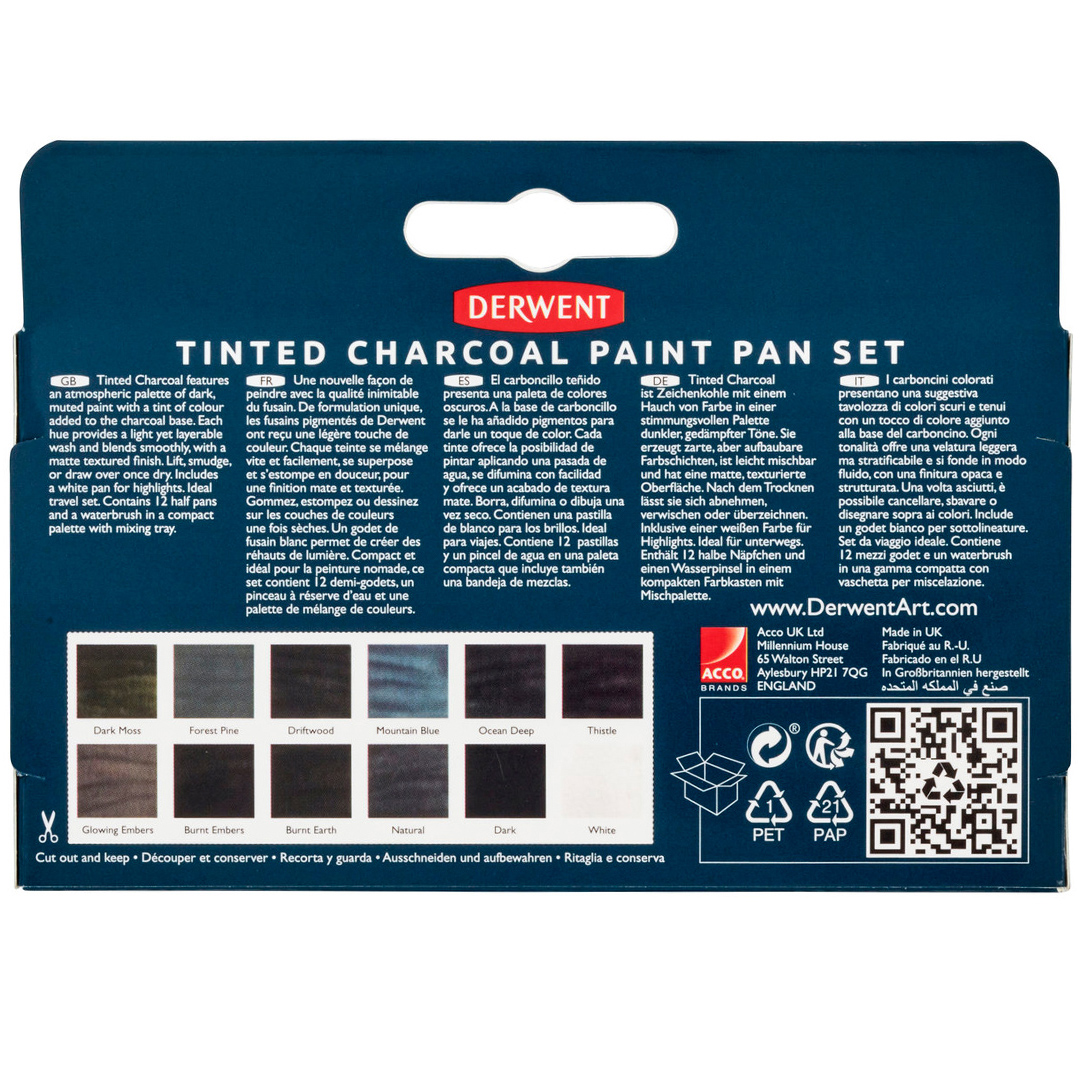 This set features a unique formula with water-soluble charcoal colours. It includes 12 dark and muted shades plus a white one for highlights. You can create both rich tones and transparent transitions. The colours are matte with a subtle tint, combining the characteristic texture of charcoal with impressive depth and space on the paper. They apply easily when wet and blend smoothly together.
