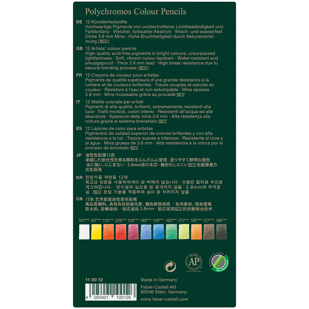This set contains 12 Polychromos in various colours, packaged in a durable metal case.