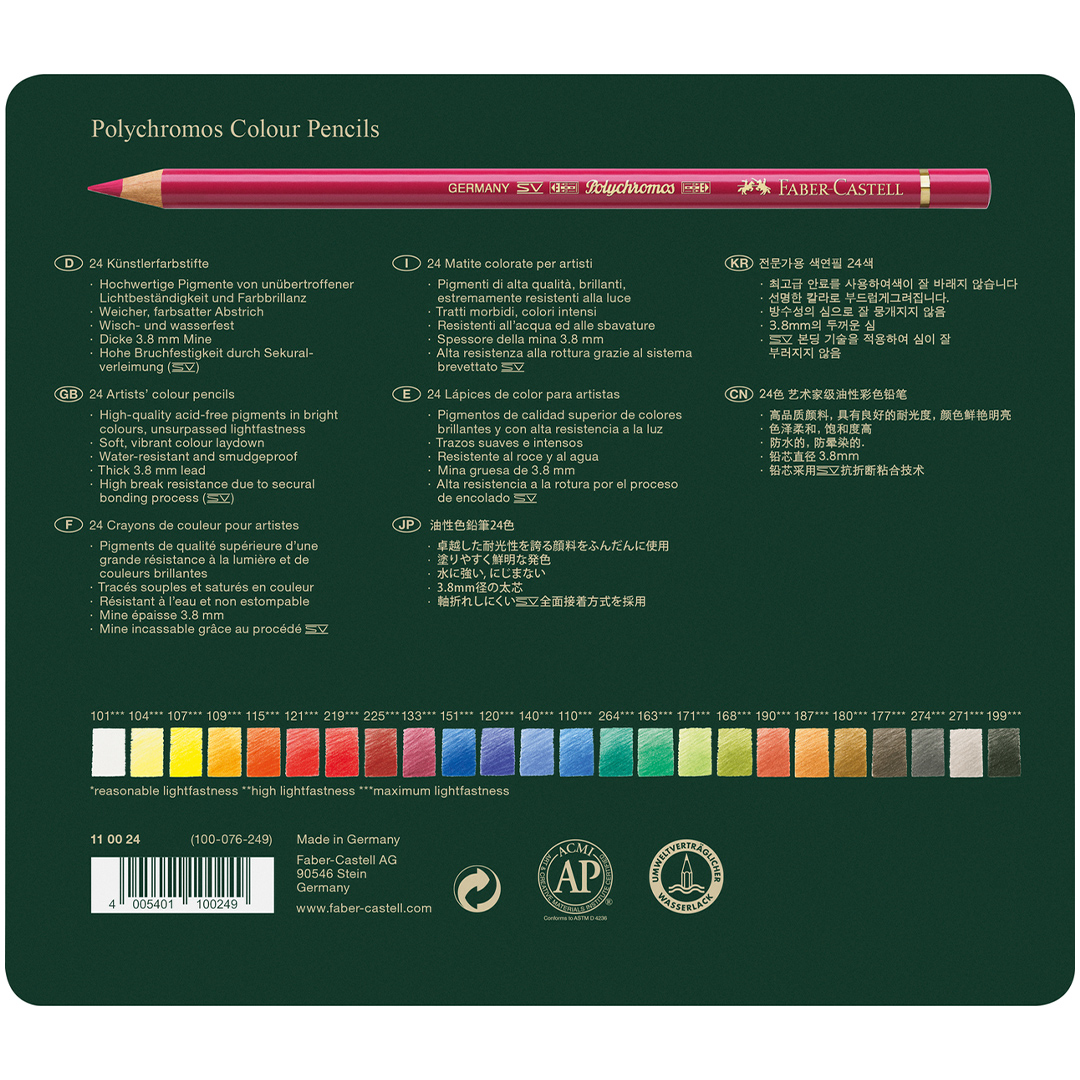 This set contains 24 Polychromos in various colours, packaged in a durable metal case.