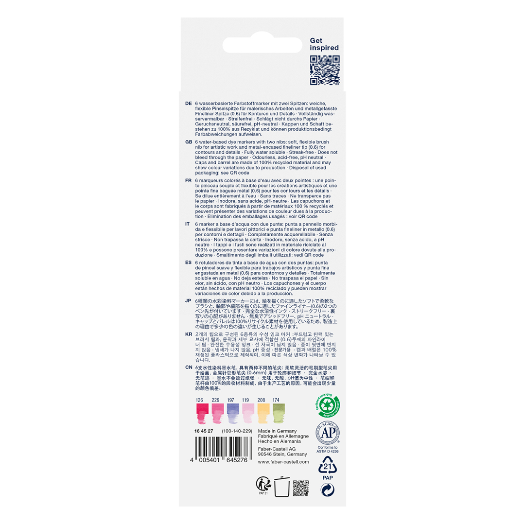 Caps and barrel are made entirely from 100 % recycled plastic. Odourless, acid-free and pH neutral ink.