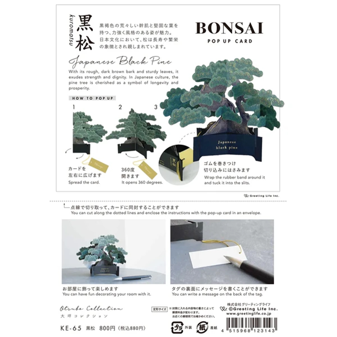 This pop-up card transforms into a three-dimensional bonsai tree when unfolded. The card opens 360° from folded state and stands open as a beautiful decoration. The label contains the word message. Envelope size: H173 x W120 mm