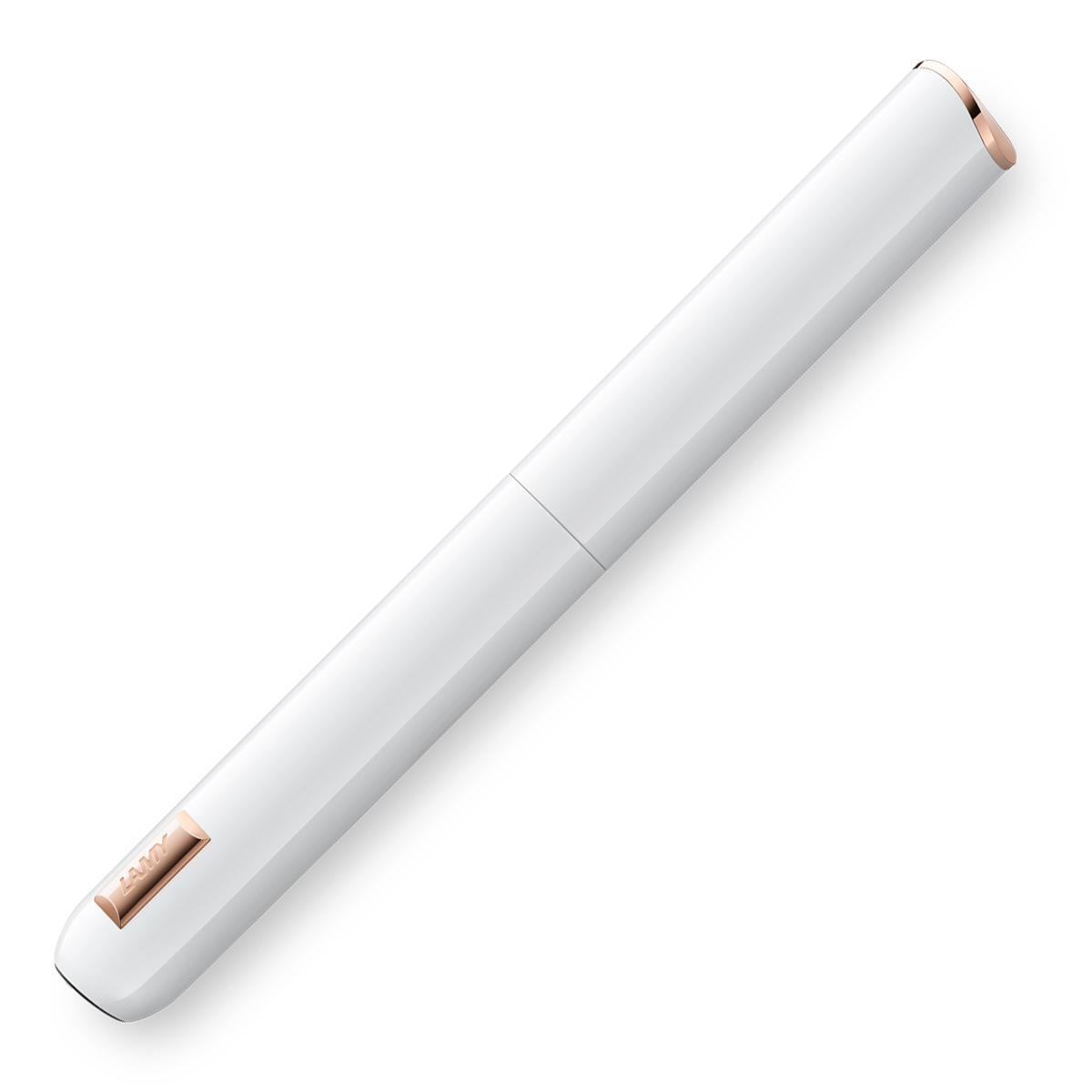 CC's compact, lacquered body is equipped with a discreet logo mark in place of a clip, which prevents the pen from rolling away. The pen has a glossy white finish. Rhodium-plated nib in 14k gold for a smooth writing experience.