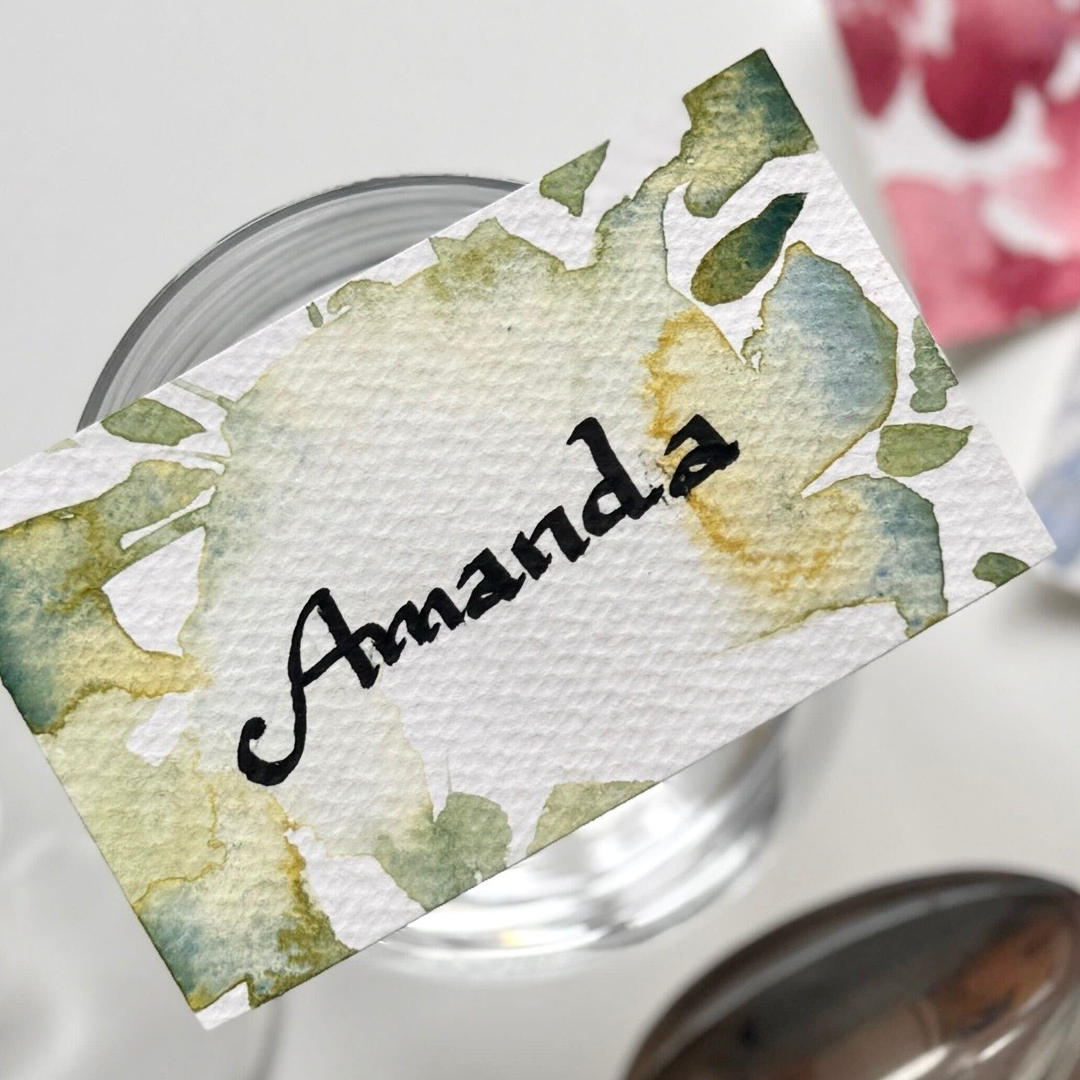 Here, we let watercolour create soft, beautiful patterns that add a marble-like, elegant touch to the table setting. What makes watercolour so special is how it moves freely across the paper, forming unexpected and unique contrasts all on its own as the pigment is allowed to flow. This very quality makes it easy even for beginners to achieve lovely effects, without needing to master any specific techniques. The watercolour style is perfect for handmade place cards for weddings, thanks to its light and romantic expression.