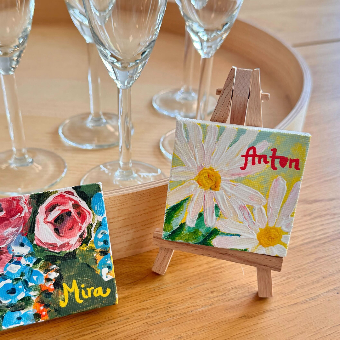 - Write the guest’s name on the canvas using a thin brush or an acrylic marker. If you prefer not to place the name on the canvas itself, you can also attach a small note that peeks out behind the easel, much like a little flag.