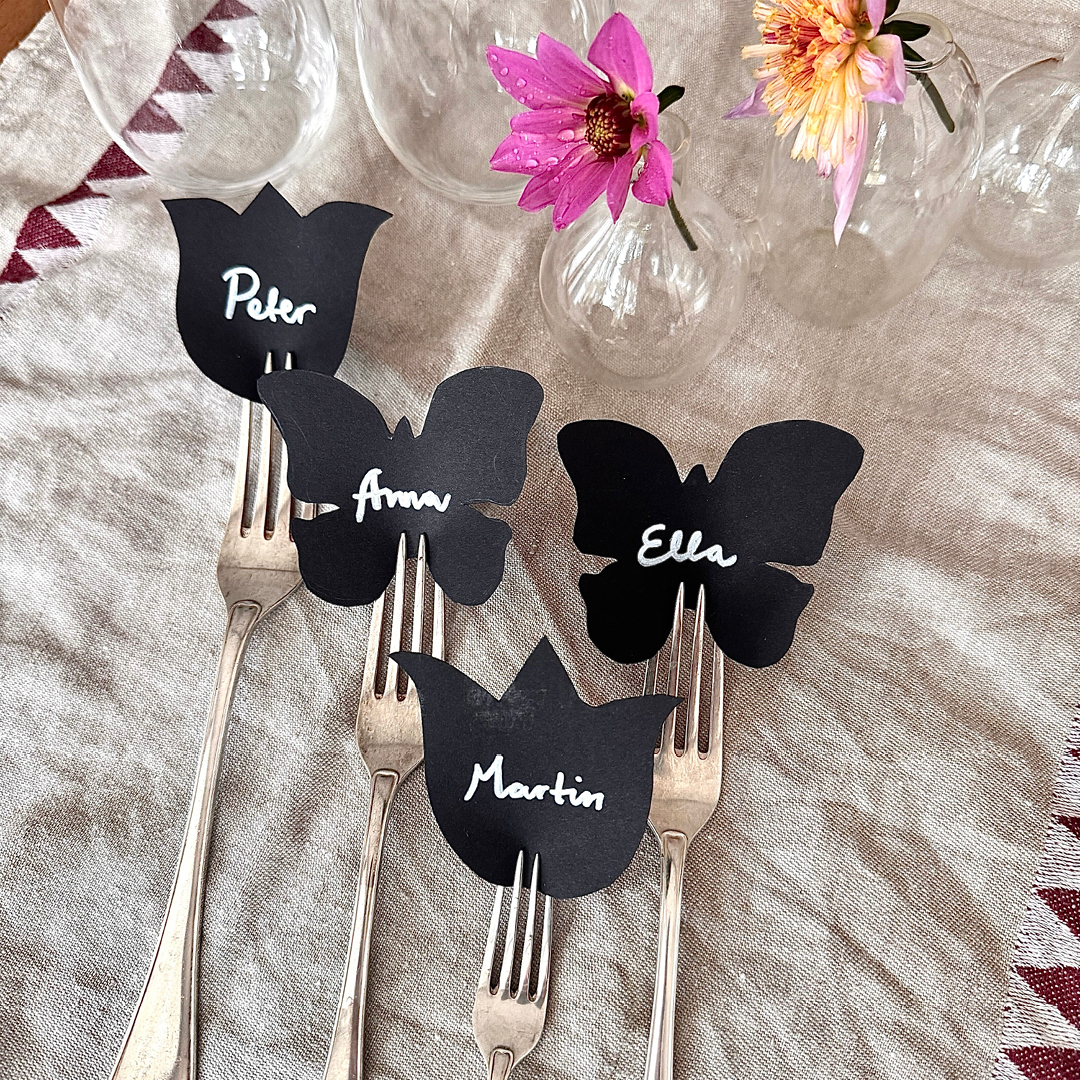This is the perfect idea if you are short on time but still want to create something elegant and memorable. The place cards are easy to adapt to the colour theme and season of your table setting. For Christmas, they look especially lovely with motifs such as gingerbread biscuits and fir trees, and for New Year’s celebrations you can use metallic pens and glitter paper.