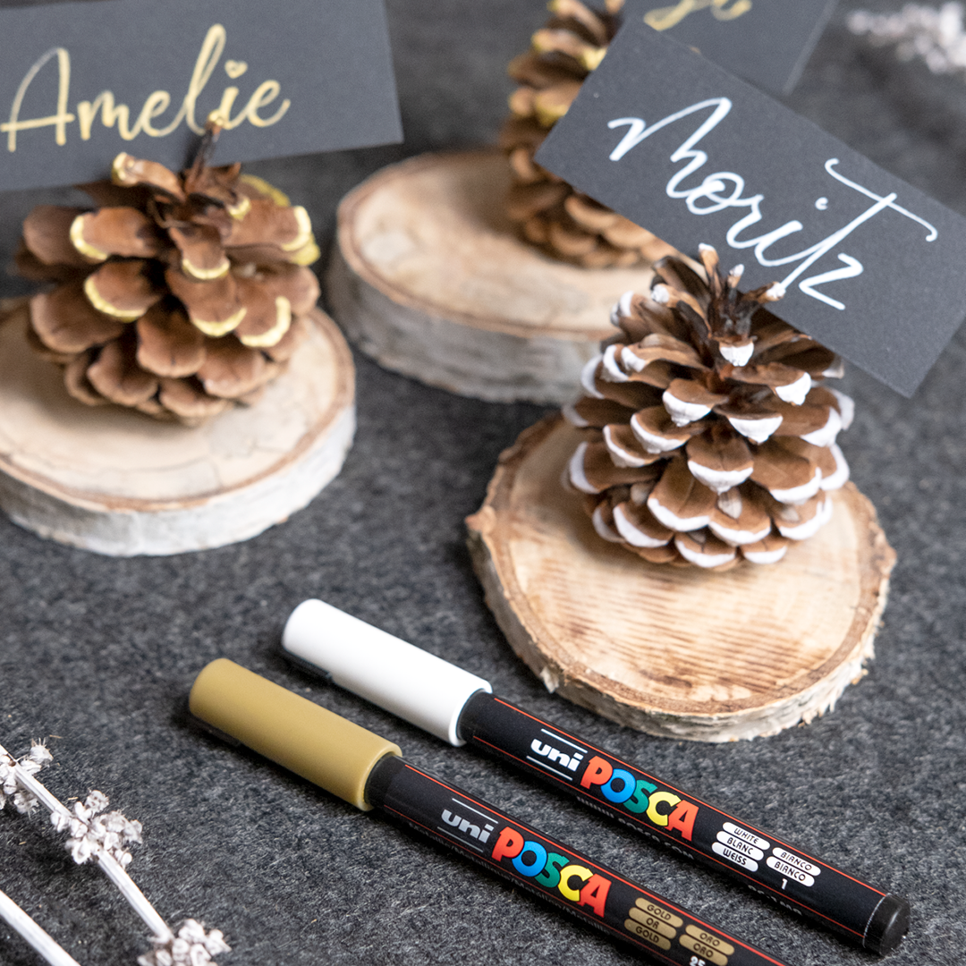 Give your place cards a graphic look with the help of acrylic markers! Have fun and combine them with all kinds of pens you have at home. Mix fineliners with acrylic markers and gel pens. The advantage of using pens is that they are easy to work with and dry quickly, which makes them perfect for both quick ideas and more detailed designs. You decide the level of ambition. The best part is that you can create stylish place cards in just a few minutes!