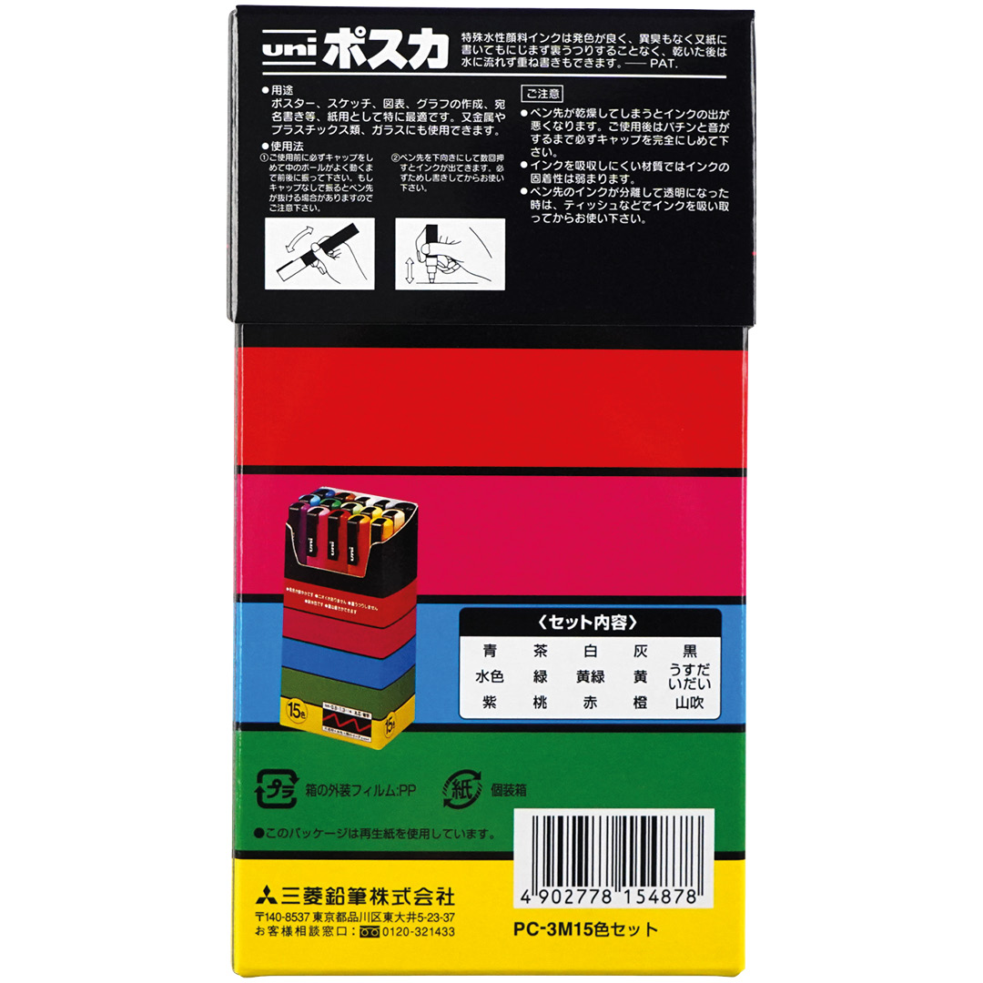 The set contains 15 colours: Purple, peach, red, orange, golden yellow, light blue, green, yellow-green, yellow, light orange, blue, brown, white, gray, black