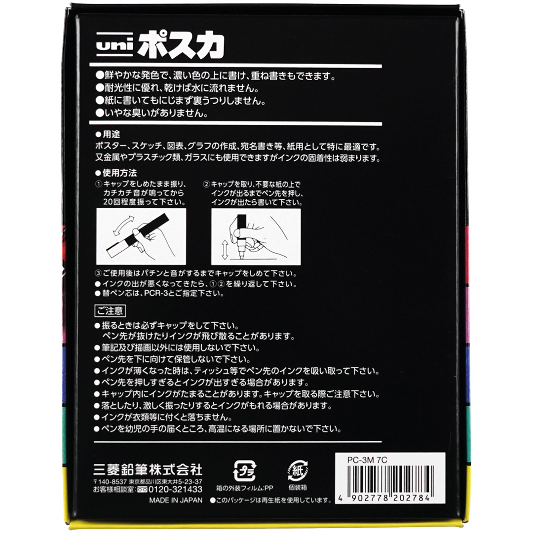 Uni Posca is a water-based opaque paint pen with pigments that adhere to a range of surfaces like paper, cardboard, wood, stone, textile, glass, plastic, and metal. The colour is permanent on many porous substrates and can be removed from smooth surfaces, making experimentation easy without damaging the base. The colour dries quickly, is odourless, and suits both spontaneous craft projects and more advanced artistic works.
