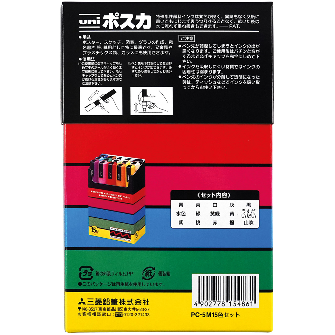The set contains 15 colours: Purple, peach, red, orange, golden yellow, light blue, green, yellow-green, yellow, light orange, blue, brown, white, gray, black