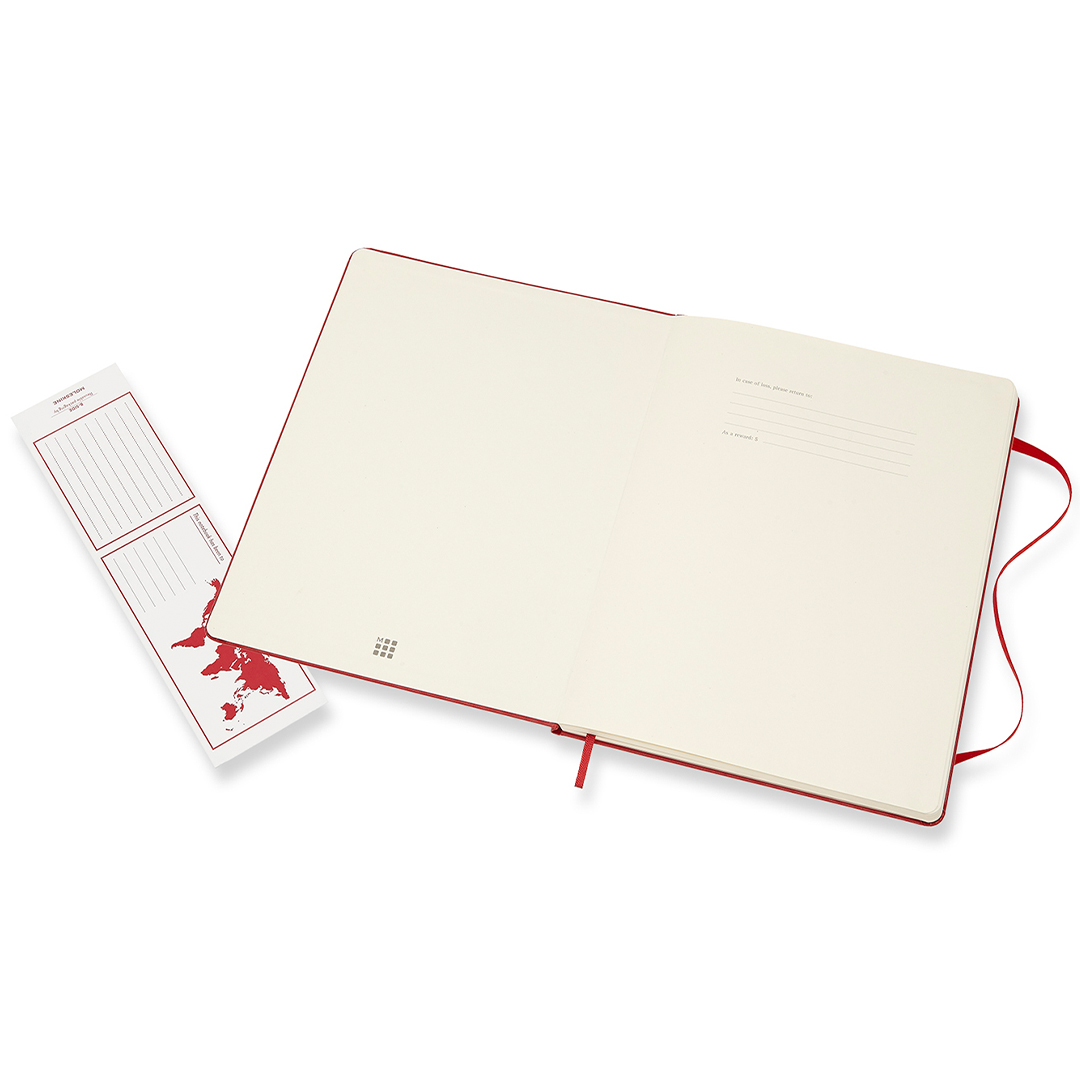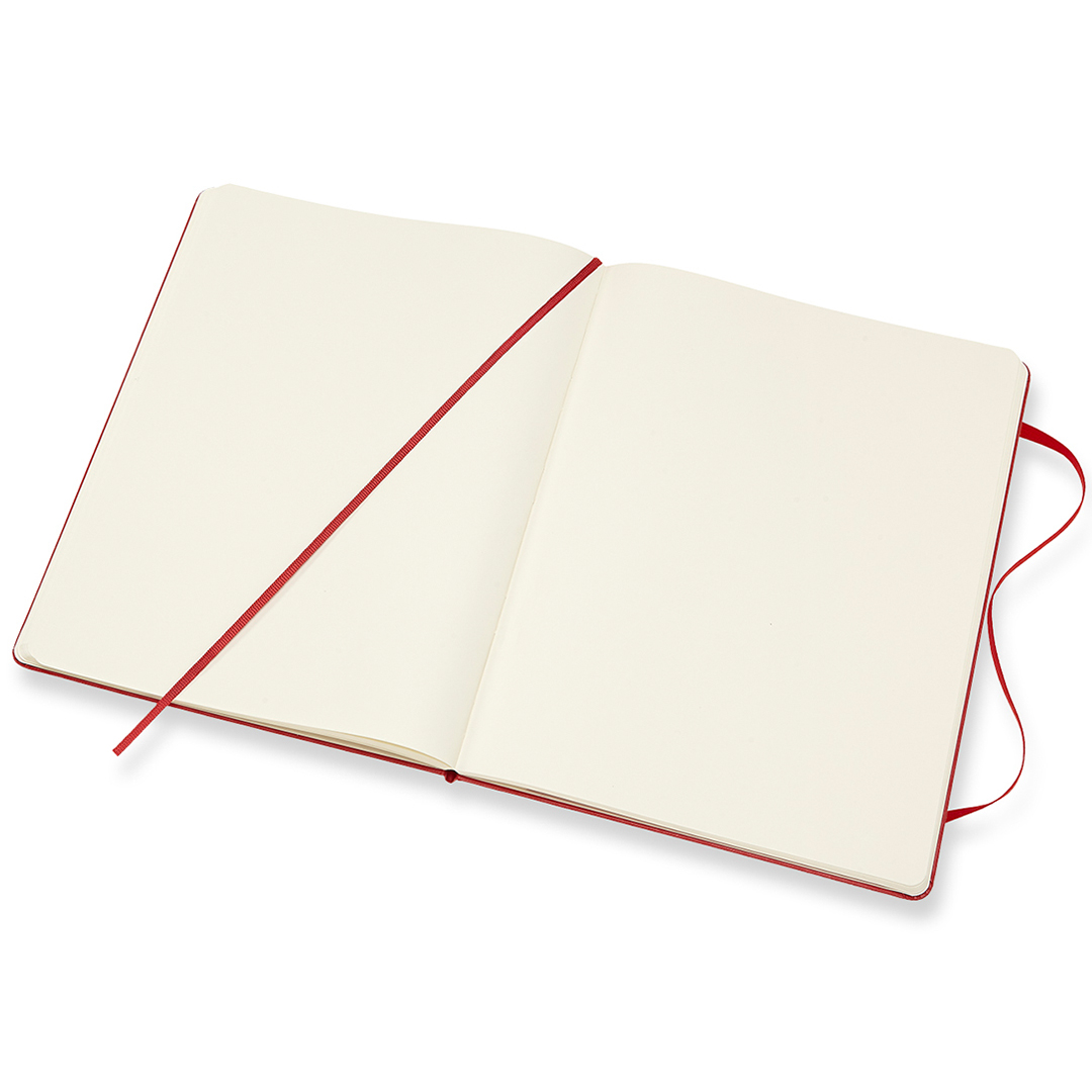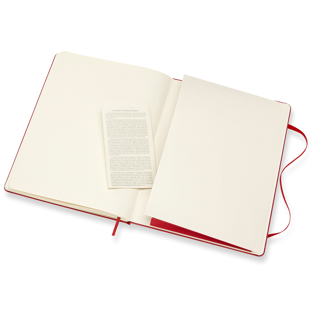 Hard cover notebook in XL size (19 × 25 cm) from Italian brand Moleskine. The notebook contains 192 pages and features an expandable inner pocket and an elastic closure to keep it securely shut when not in use. The ivory-coloured paper is FSC-certified, acid-free, and of premium quality!