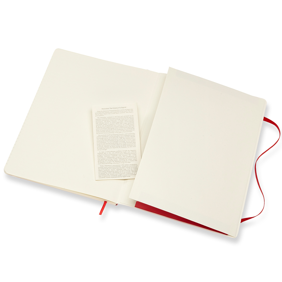 Notebook with soft flexible cover in XL size (19 x 25 cm) from Italian Moleskine. The notebook contains 192 pages and features an expandable inner pocket as well as an elastic band that keeps the book closed when not in use. The ivory-coloured paper is FSC-certified, acid-free and of high quality!