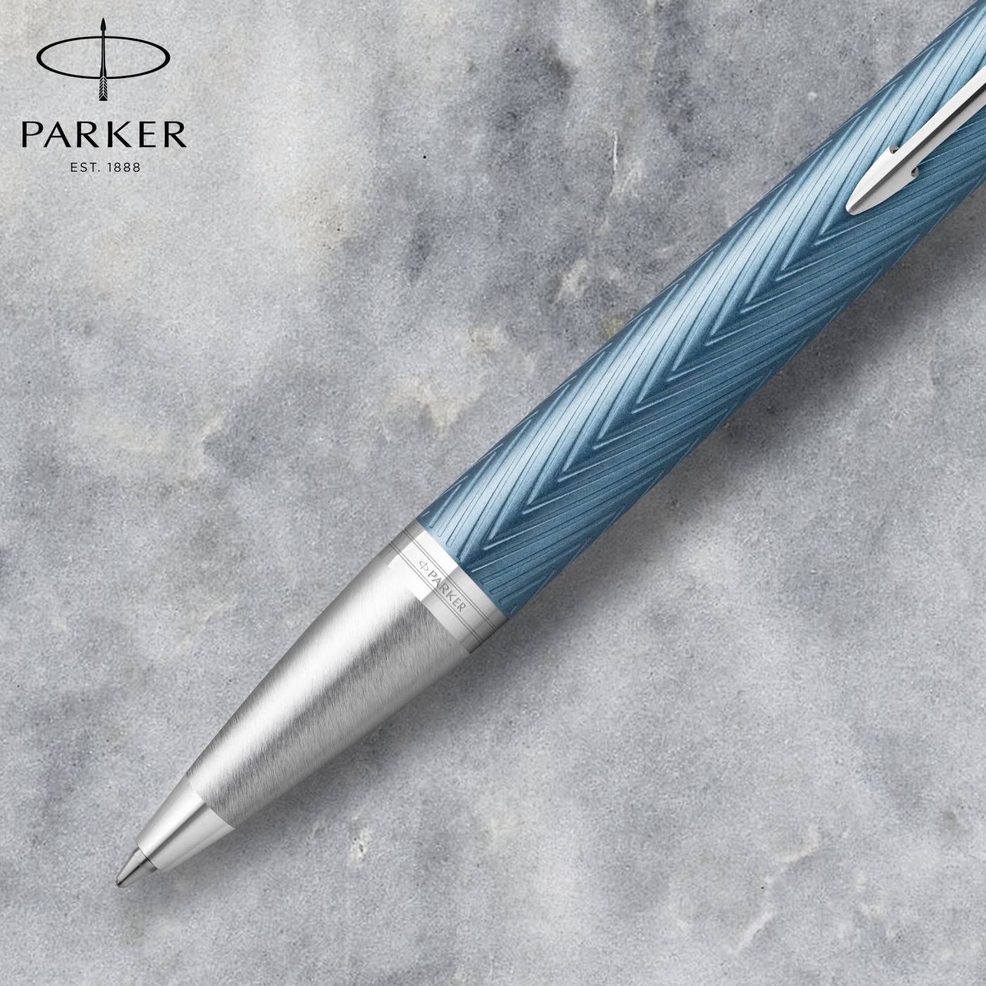 Refreshing blue-grey metallic lacquered body engraved with an iconic chevron pattern and complemented by chrome trims. Can be refilled with Parker’s own ballpoint refills. Presented in a Parker gift box, including one refill. This design is also available as a rollerball and fountain pen.