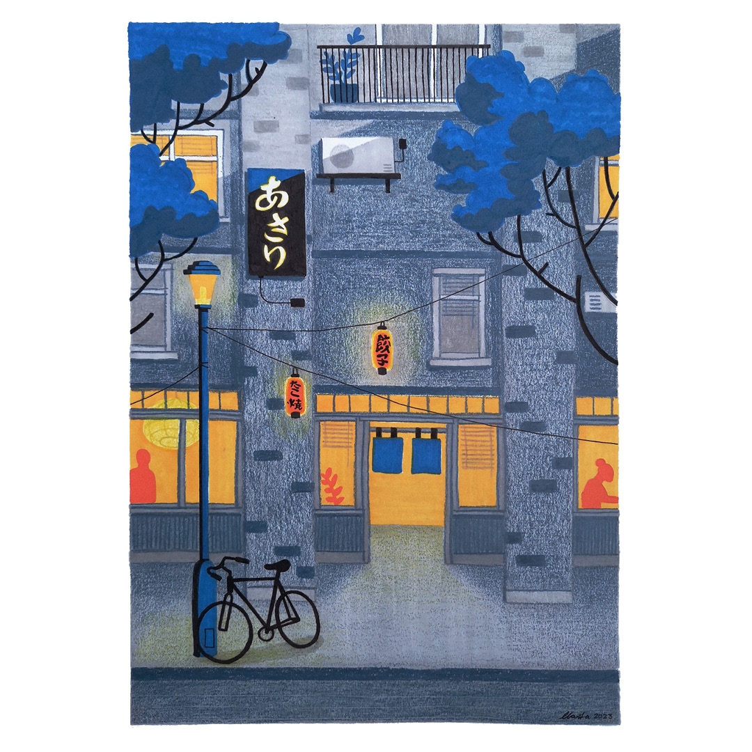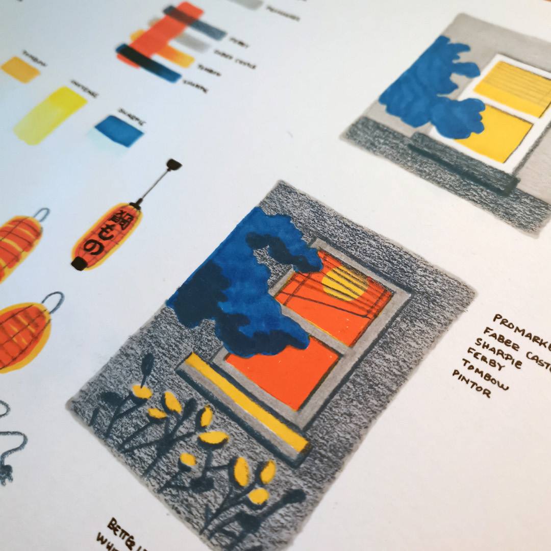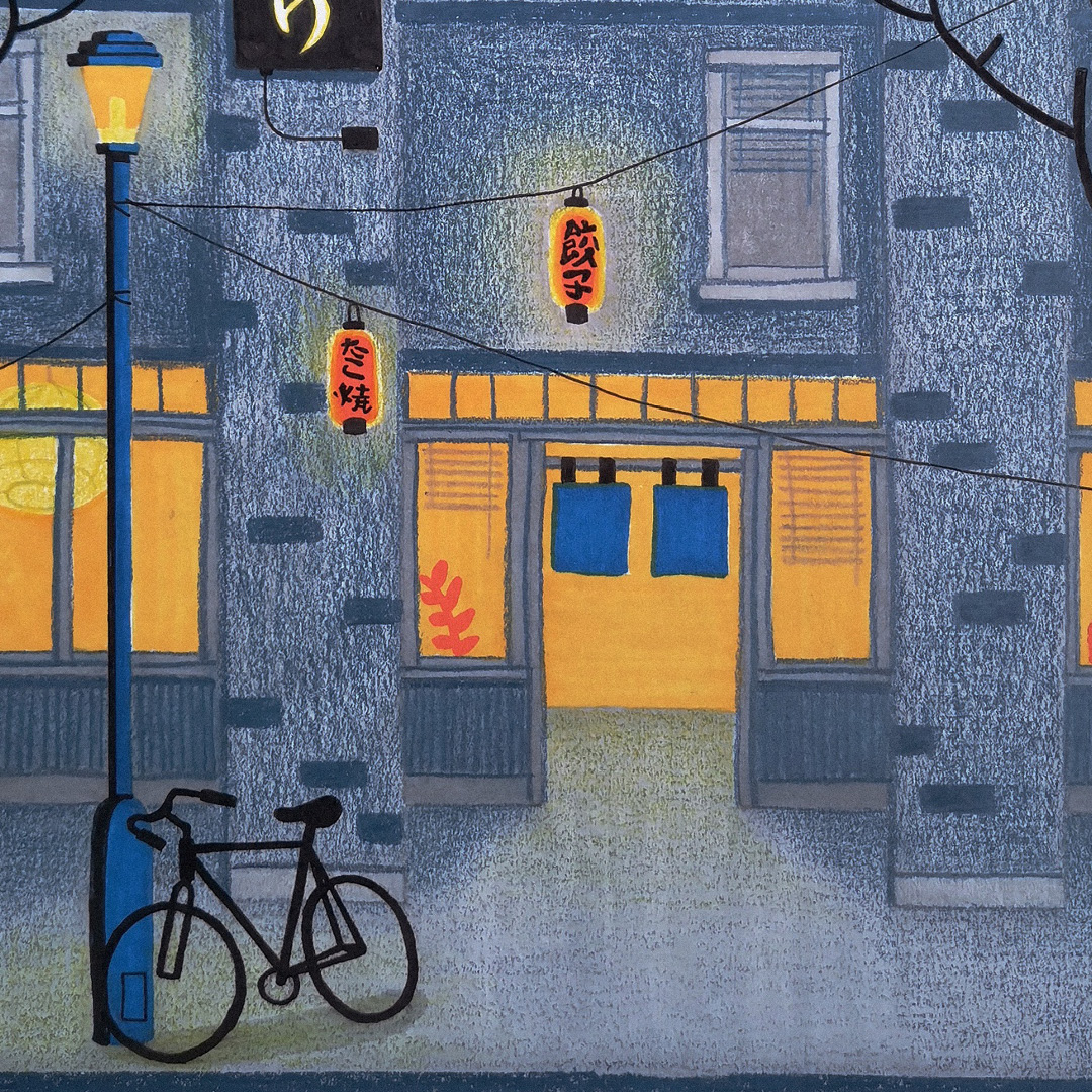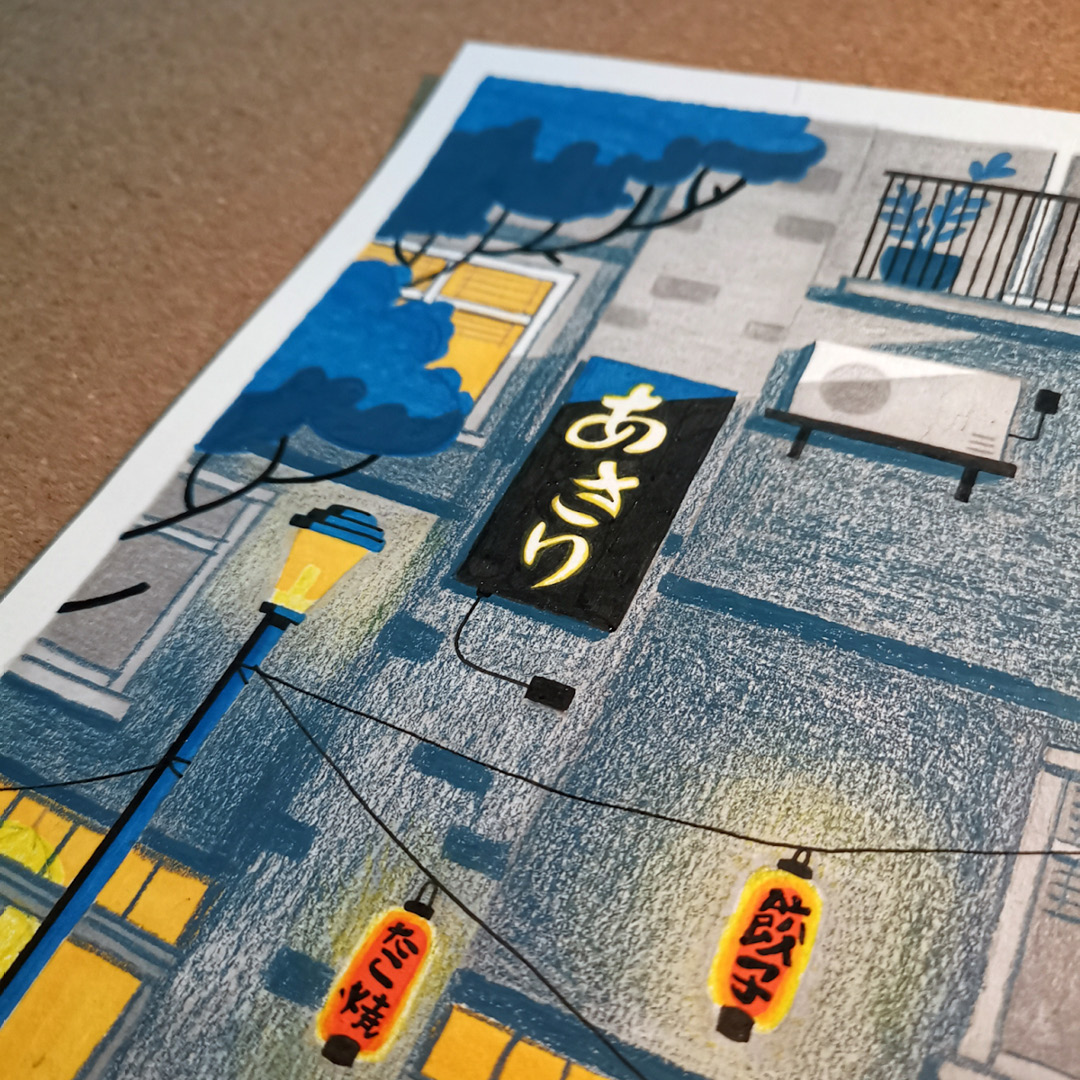 The motif was largely inspired by the pens themselves. The dark blue tones combined with vibrant yellow and orange shades reminded me of an evening in lively city streets. I wanted to illustrate life on a dark evening. At the same time, I wanted the colours and textures of the pens to stand out. That is why I chose a relatively flat composition, where perspective would not distract from the colours and textures of the piece.