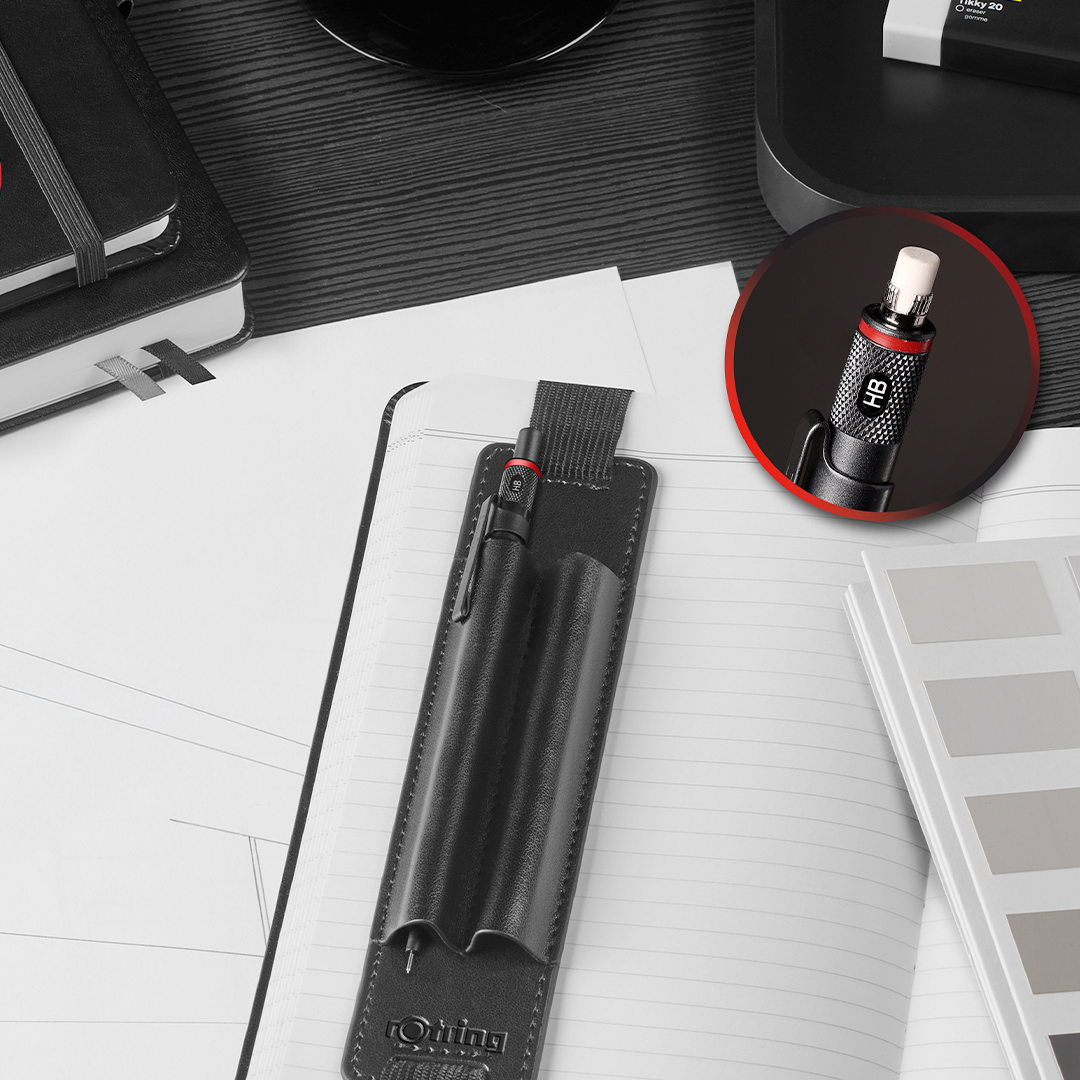 The set includes: A black Rotring 600 mechanical pencil, 0.5 mm. A ruled notebook with an elastic band to keep it closed when not in use, and a red ribbon bookmark for quick access. An elegant pen case designed to hold two pens, with elastic straps to attach it to the notebook.