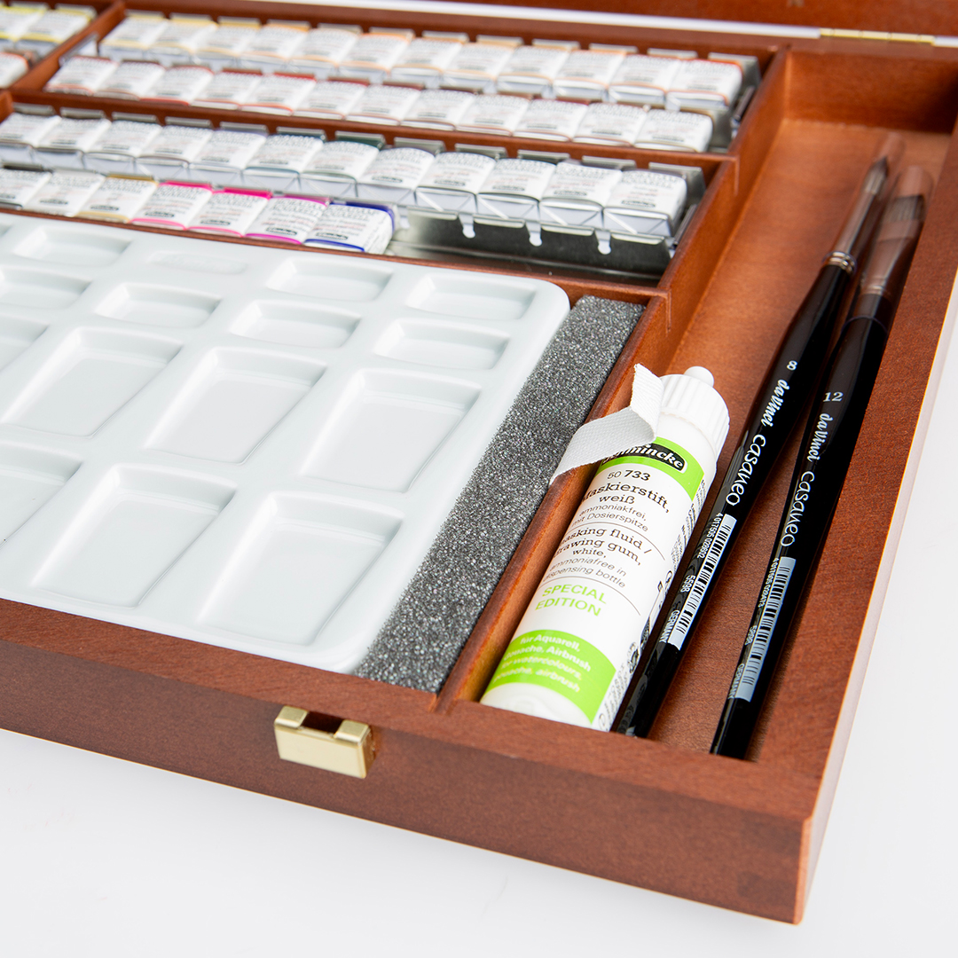 The wooden box also includes a porcelain palette, masking pen and two da Vinci brushes.