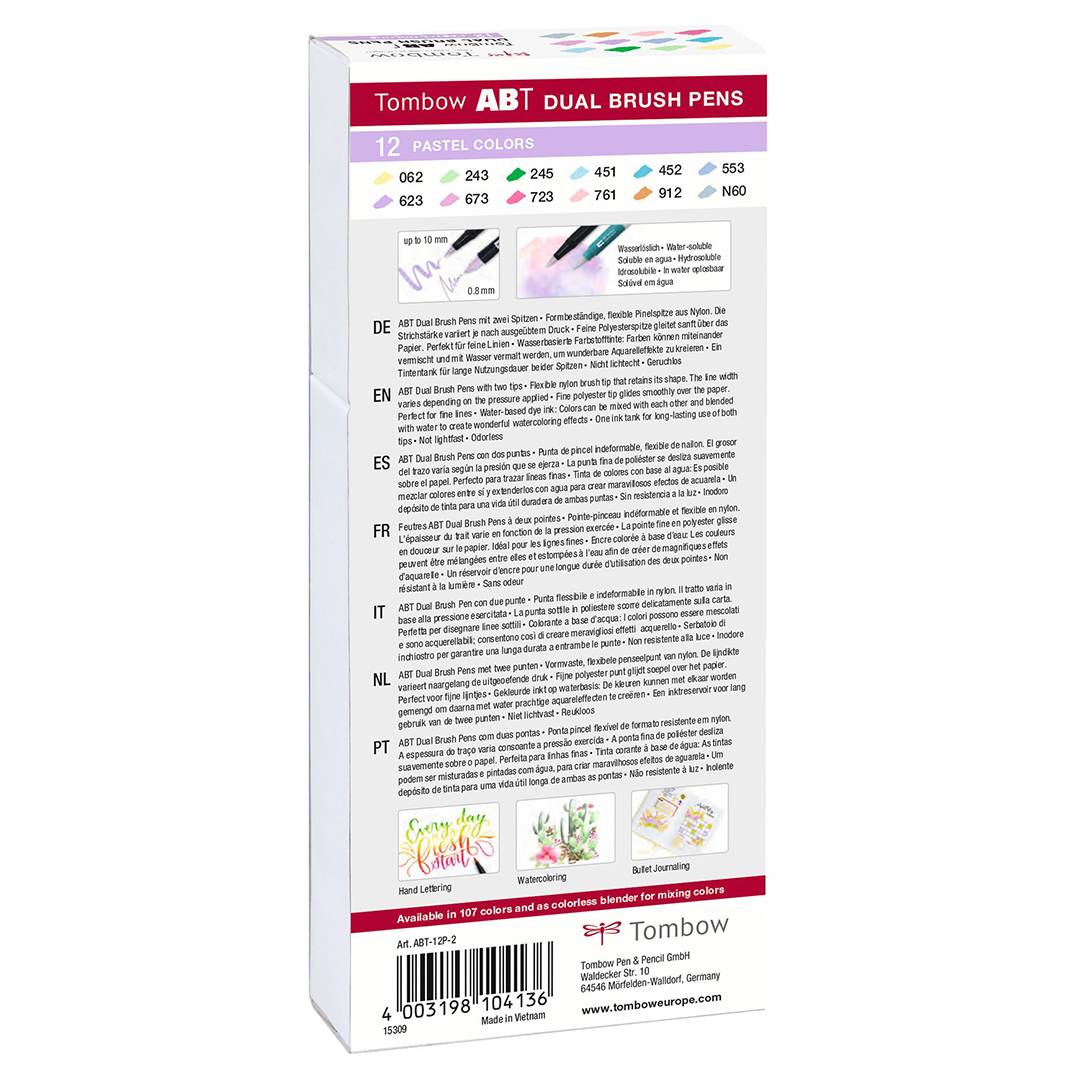 The set contains 12 x ABT Dual Brush Pens: N60 cool grey6, 062 pale yellow, 243 mint, 245 sap green, 451 sky blue, 452 process blue, 553 mist purple, 623 purple sage, 673 orchid, 723 pink, 761 carnation, 912 pale cherry.