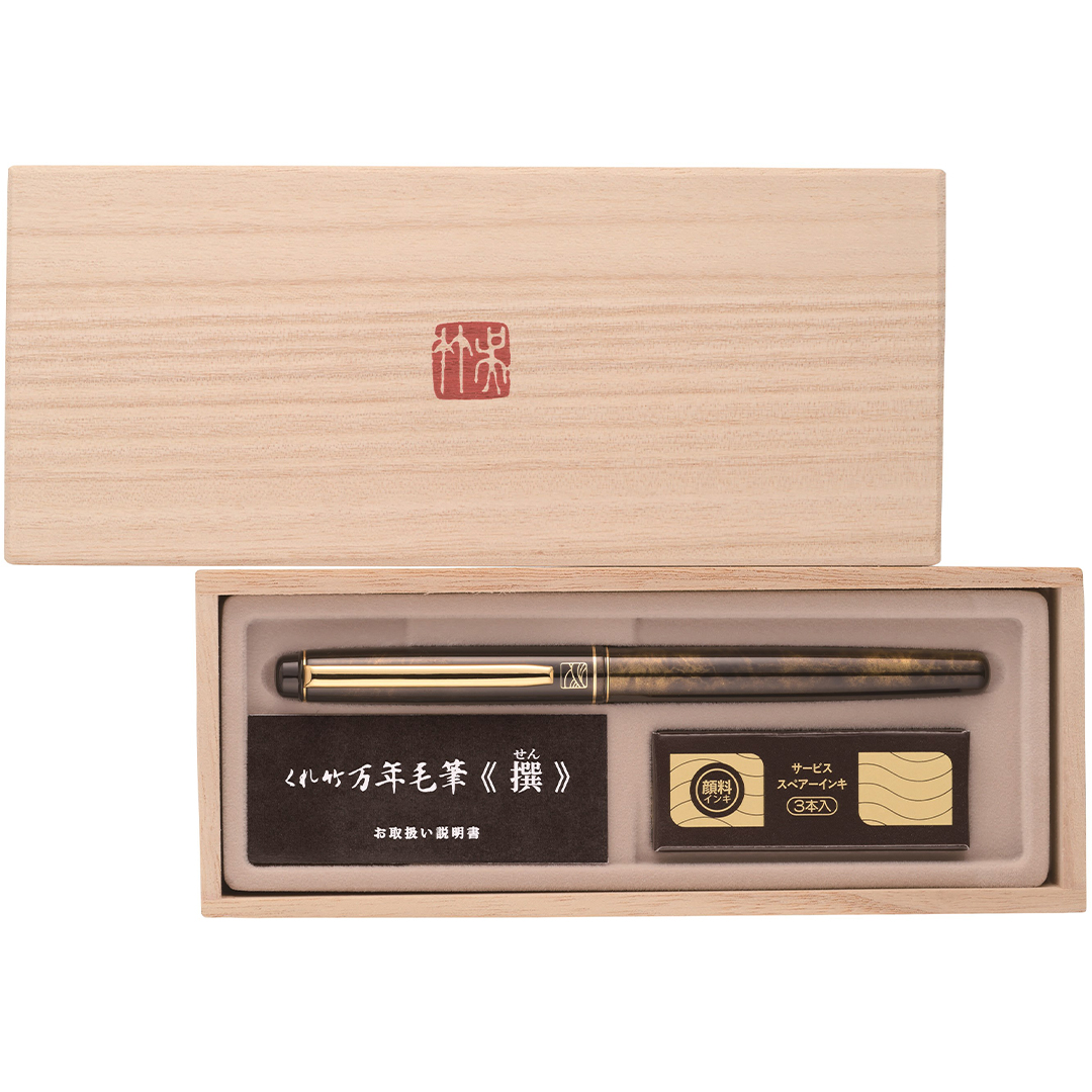Kuretake Mannen Mouhitsu "Sen Bekkou-cho" is a refillable premium brush pen with elegant design inspired by traditional Japanese aesthetics. It features a synthetic brush tip made of elastic polyester bristles that provides exceptional flexibility for line variations from very fine to broad strokes.